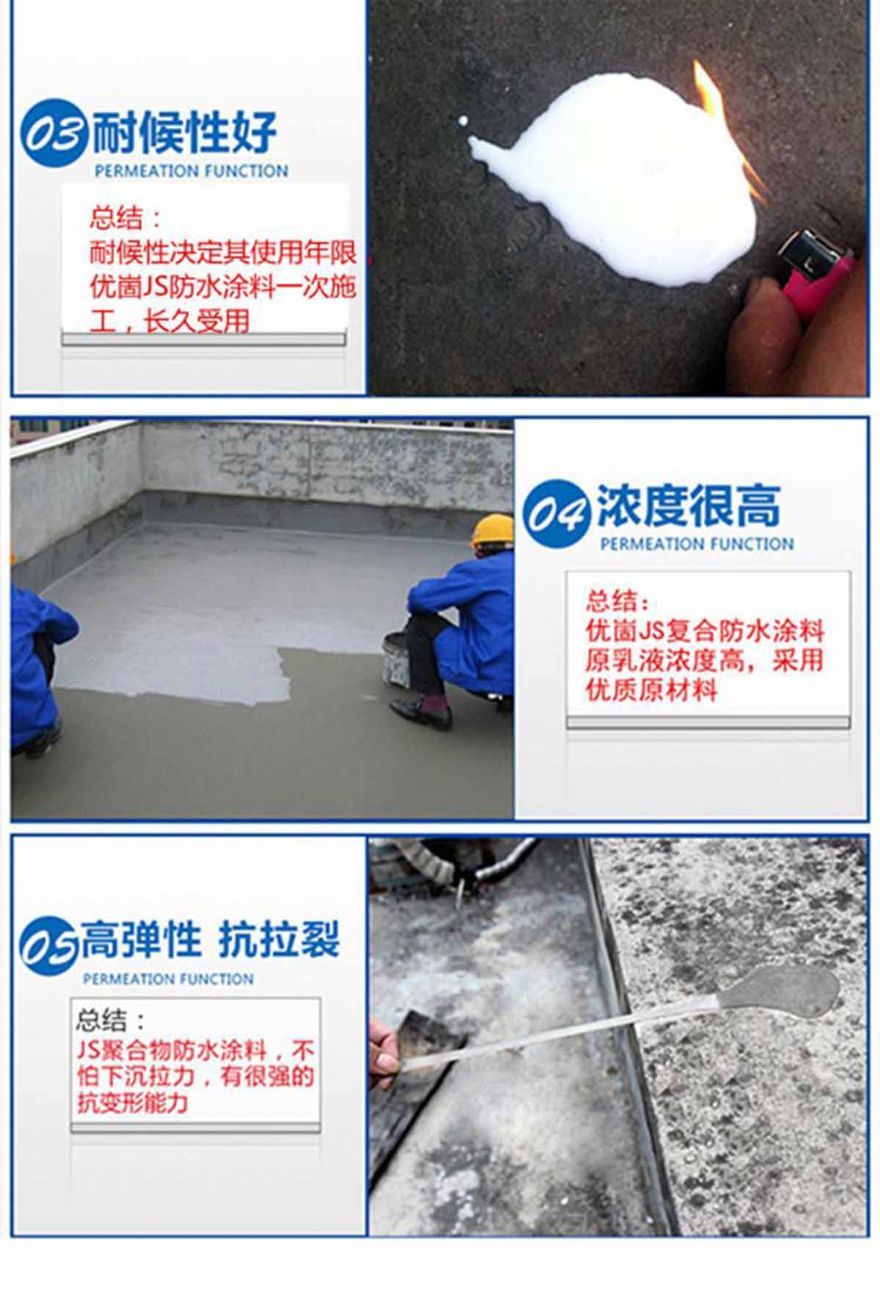 ①JS-Ⅰ型主要用于變形較大的部位如屋面、地下室等。.水性涂料,無毒、無害、無污染、是環保型涂料。可直接在混凝土表面施工并粘接牢固。冷施工,操作更方便,基層含水率不受限制,但基層表面不可有積水,工期短。凝結時間短,施工2小時后方可進行下道施工工序。粘接性能佳。